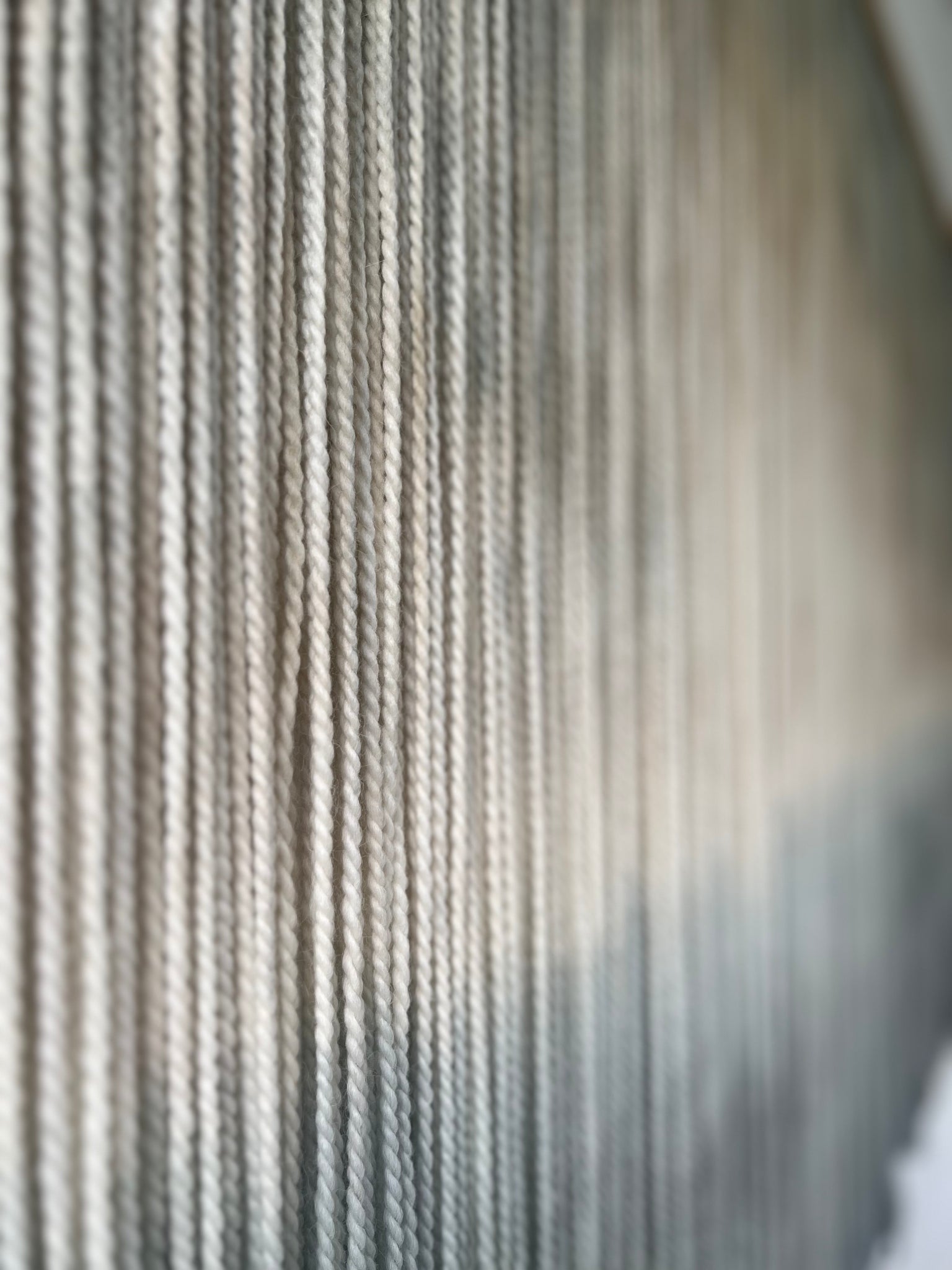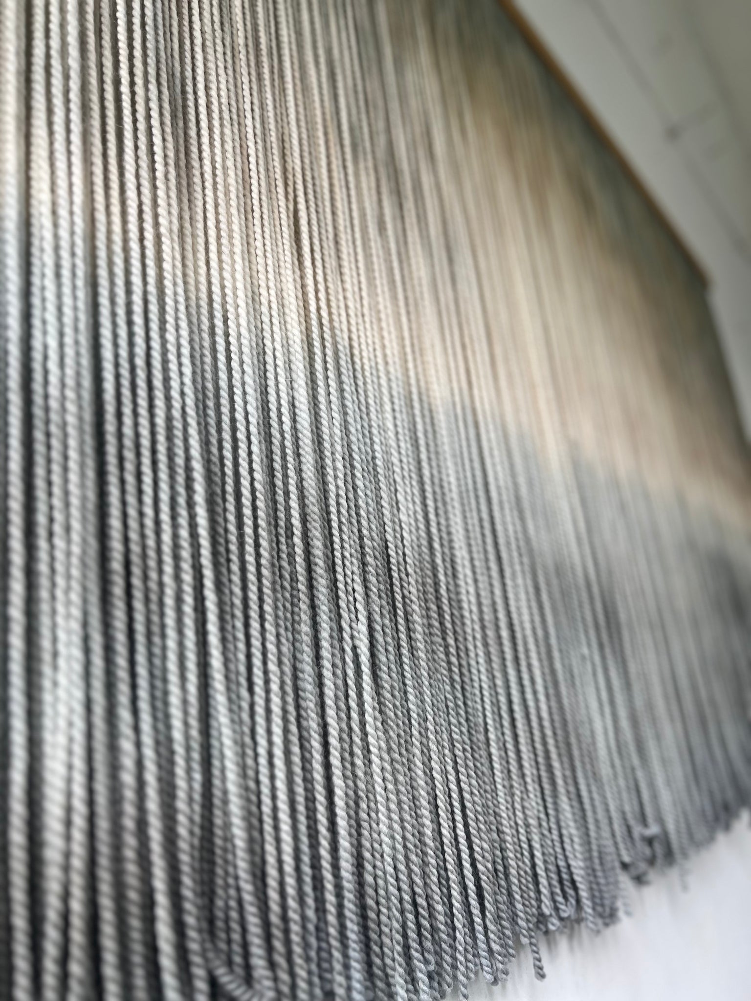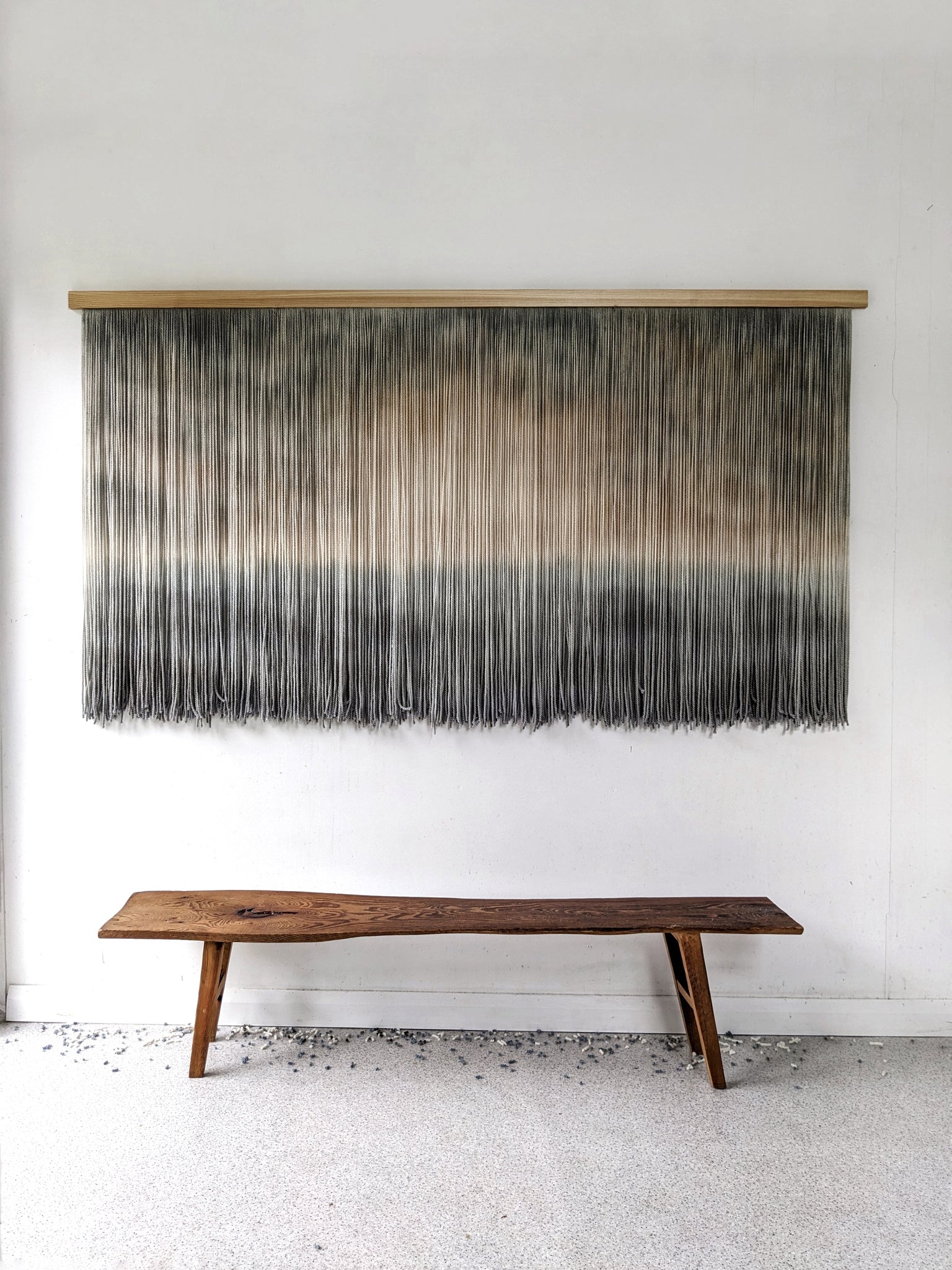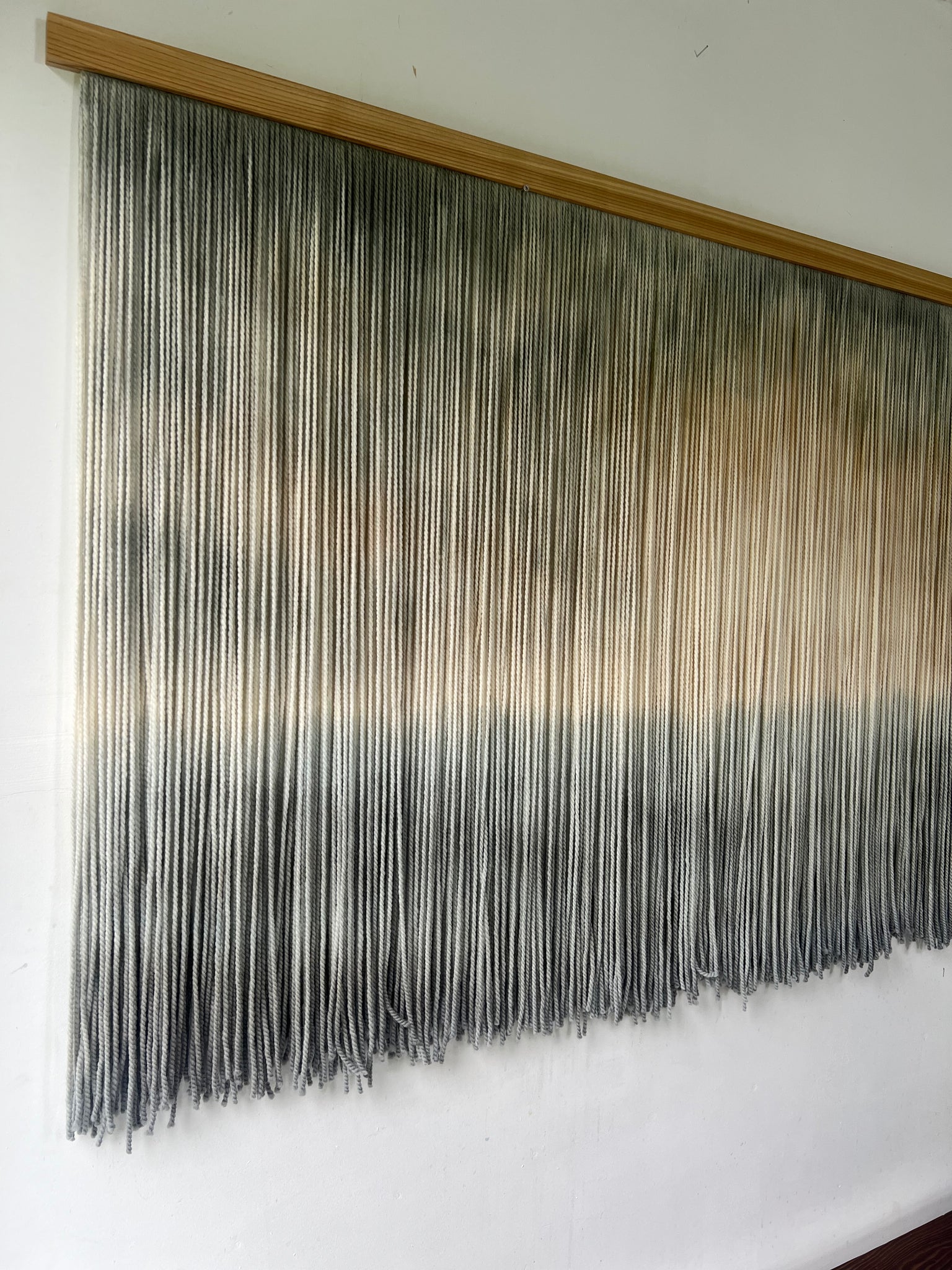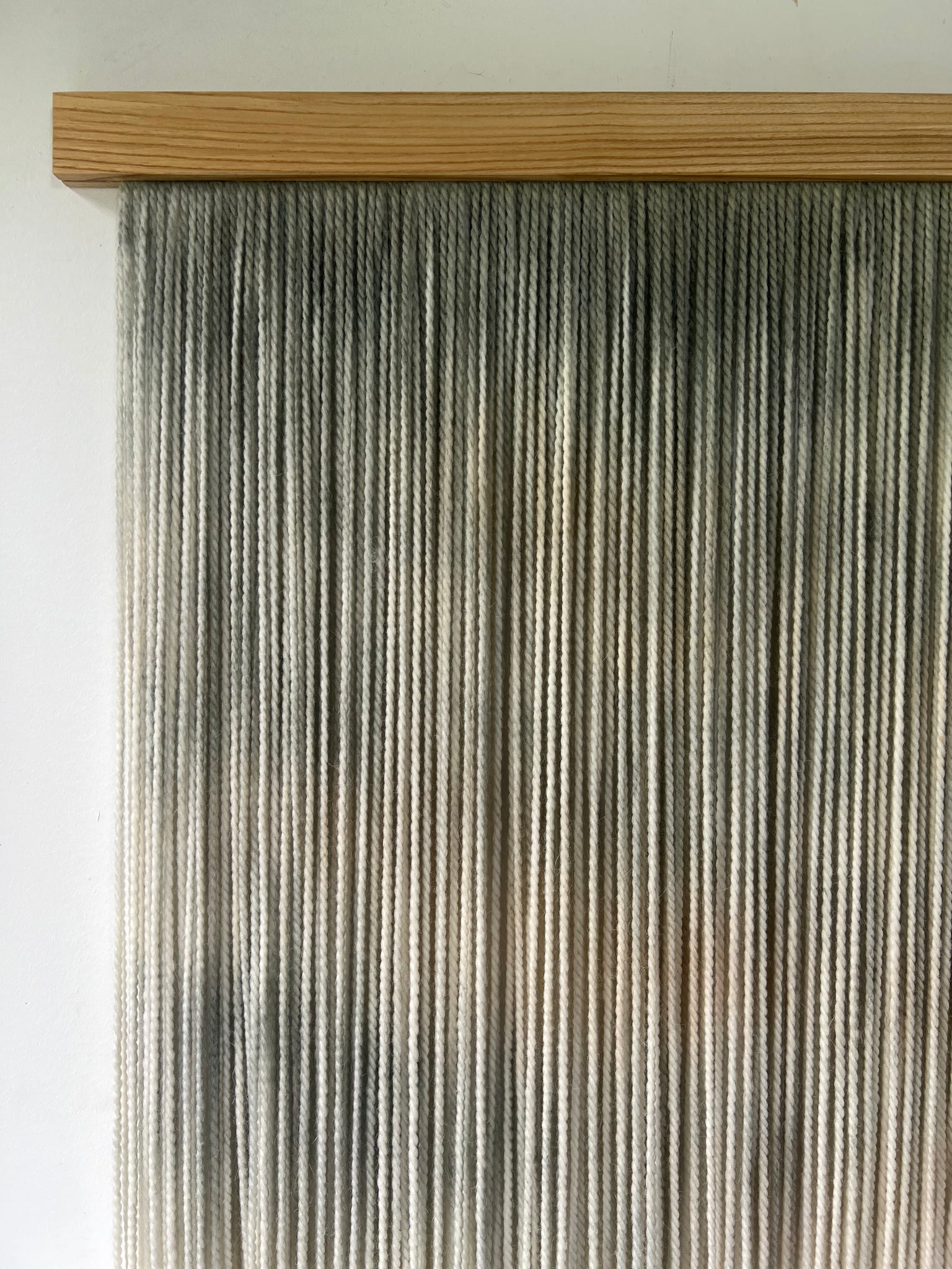 This dip dye wall hanging, is made of natural color soft wool hand dyed in shades of gray, beige and blue finished with an oak wood panel. Fiber art like this will suit perfectly a minimalist living room, bohemian bedroom and modern office.
